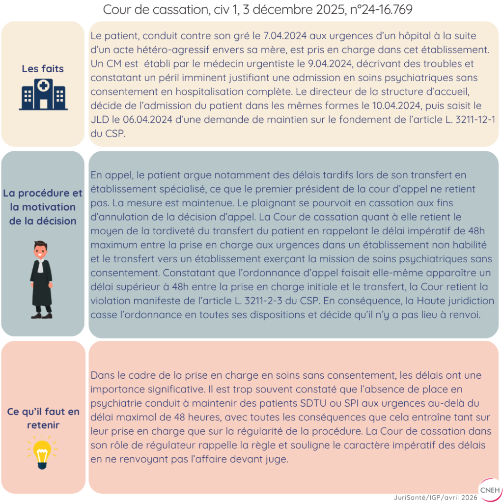 Flash jurisprudence – Transfert MCO‑psychiatrie : la Cour de cassation réaffirme le délai des 48 heures